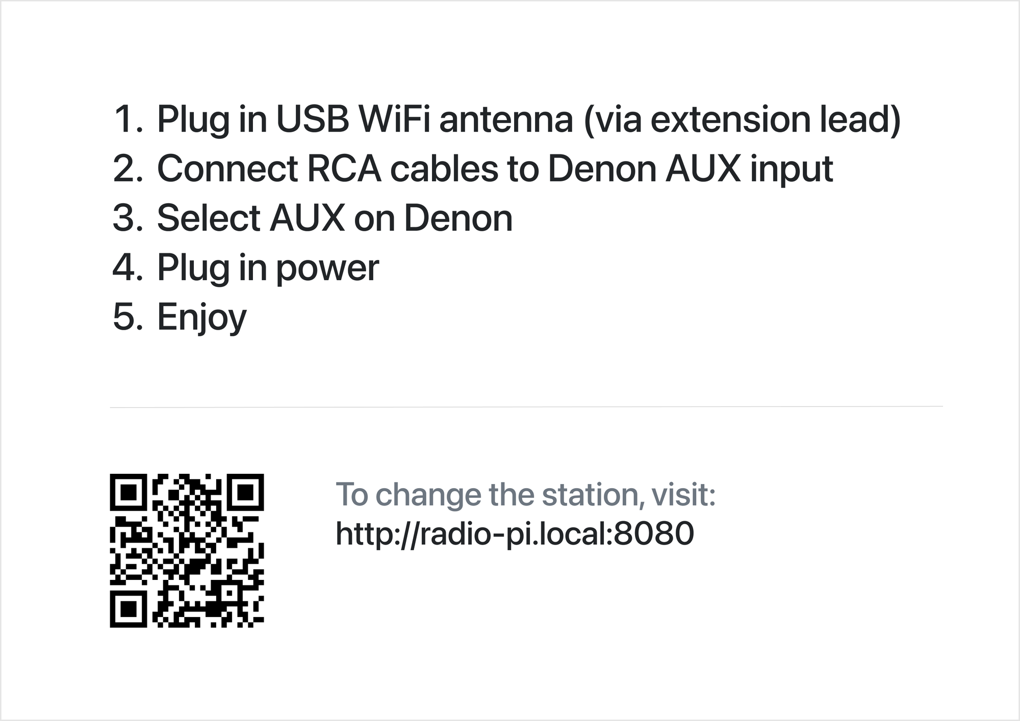 My goal is an always-on device that plugs into the AUX input on the Hi-Fi; effectively making that input the 'Ad-free radio' input. It also needs to start, connect, and play automatically.