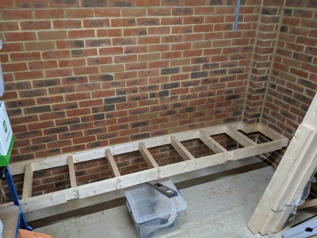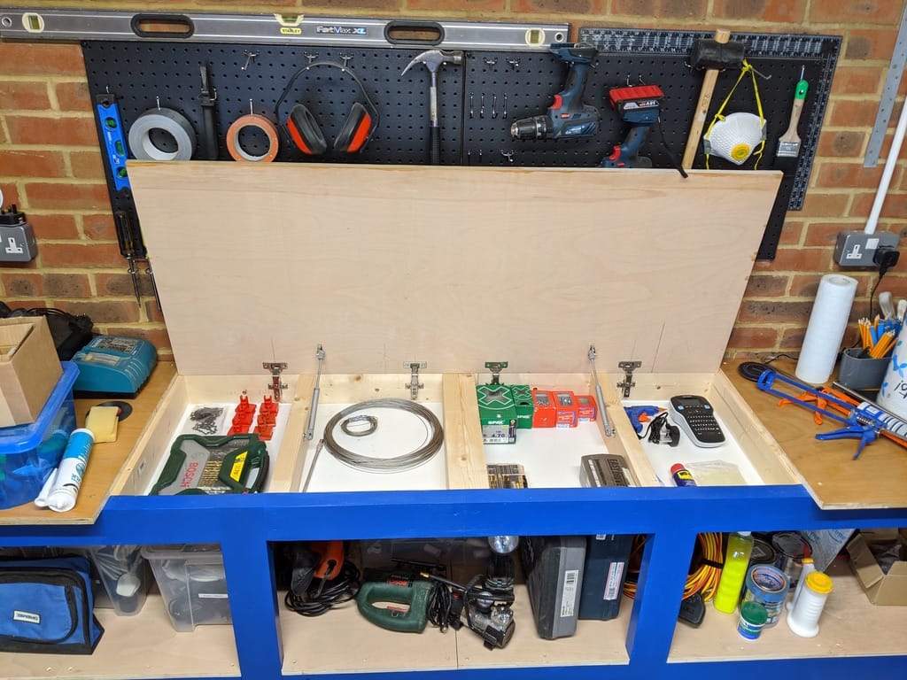 Pretty happy with how the bench turned out. If we were to do it again I wouldn't have made the central section openable. While it gave more storage, there are always things on top and so it becomes very awkward to actually get things out.